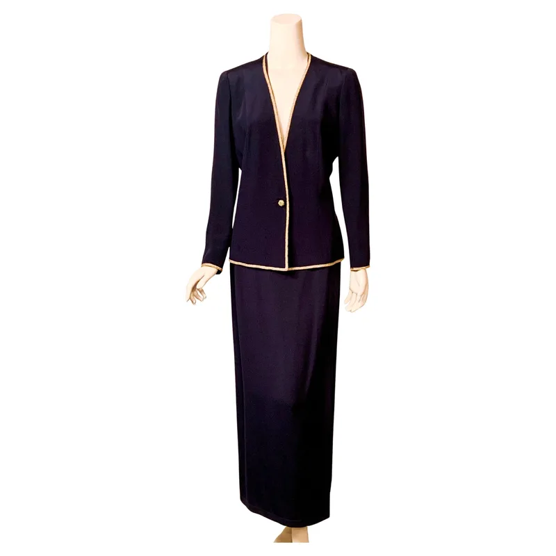 We currently track 1 listing for the Calvin Klein Calvin Klein 1990s Navy Blue Silk Evening Suit with Metallic Gold Trim from 1stDibs.