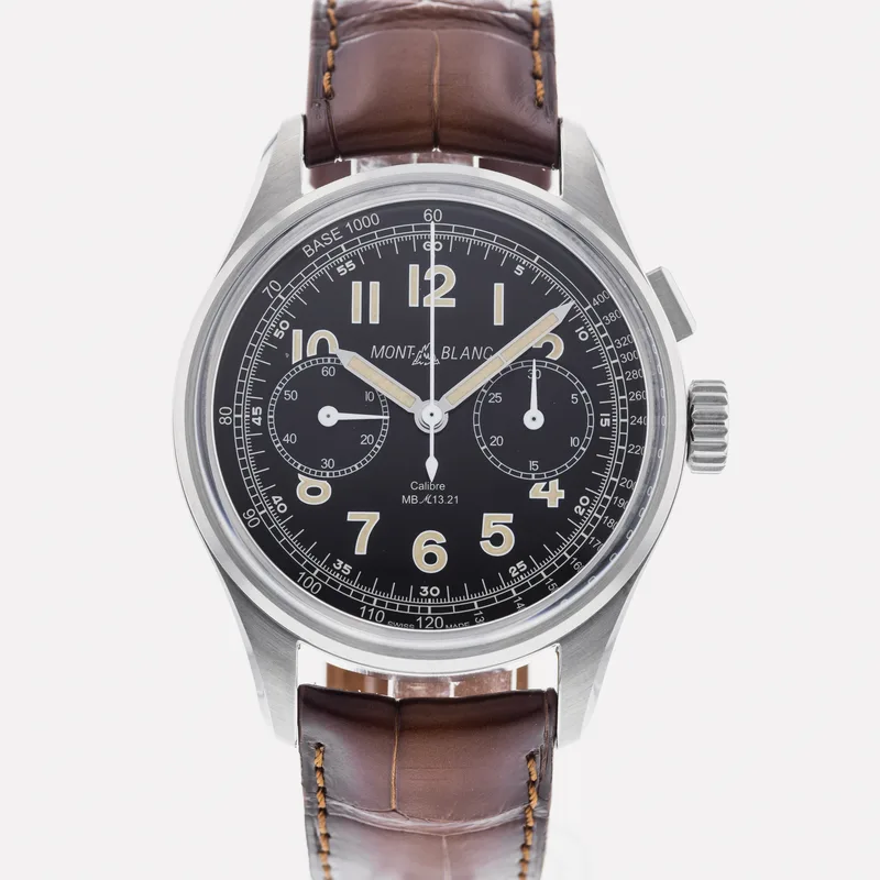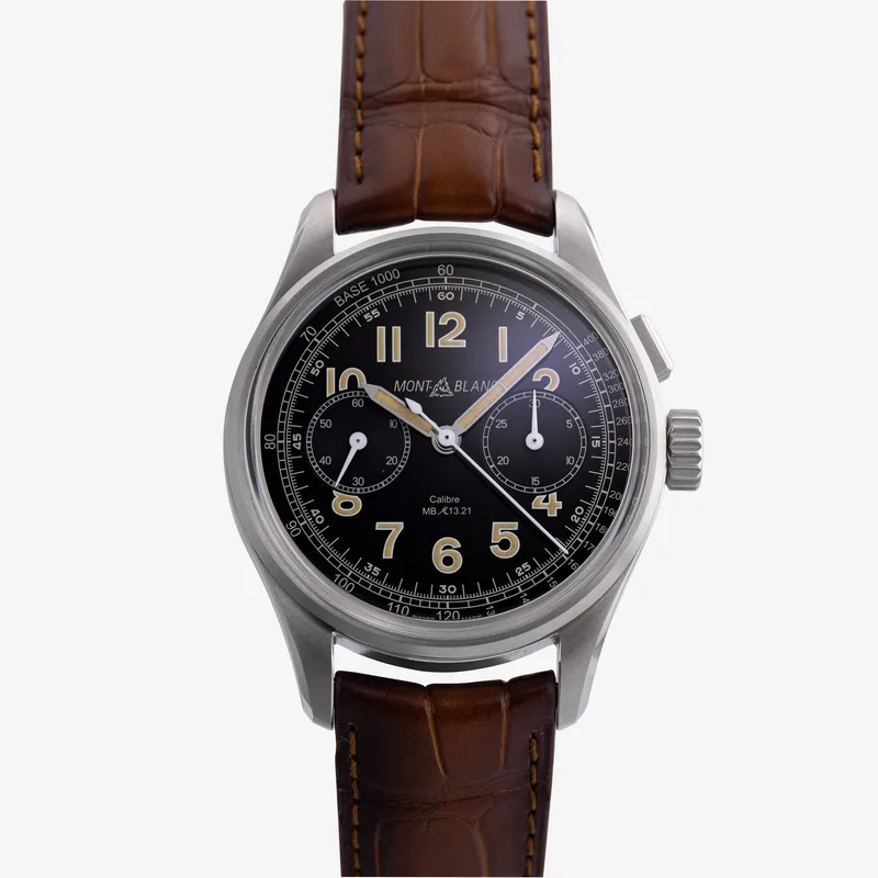 The Montblanc 1858 Monopusher HODINKEE Limited Edition 123749 is a distinguished timepiece that embodies the spirit of adventure and the legacy of precision watchmaking. This limited edition watch features a robust 40mm stainless steel case, showcasing a vintage-inspired design that pays homage to Montblanc's rich heritage in the field of horology. The striking black dial, complemented by luminous Arabic numerals and hands, enhances legibility, while the monopusher chronograph function offers both style and functionality. Crafted with meticulous attention to detail, the watch includes a polished bi-directional rotating bezel and a sapphire crystal that provides durability and scratch resistance. The elegant brown leather strap, reminiscent of classic mountaineering gear, adds a touch of sophistication and comfort, making it suitable for both casual and formal occasions. As part of the Montblanc 1858 collection, this model reflects the brand’s commitment to craftsmanship and the pursuit of excellence. The Montblanc 1858 Monopusher HODINKEE Limited Edition is designed for those who appreciate fine watchmaking and seek a timeless piece that combines heritage with modern innovation.