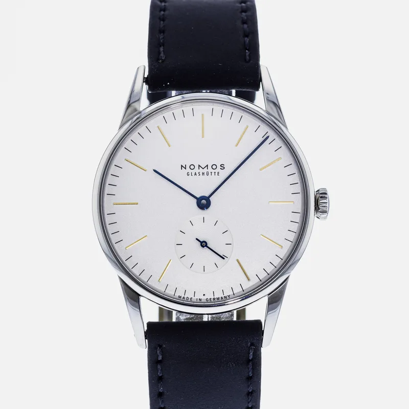 The Nomos Orion 309 epitomizes the brand's commitment to minimalist design and precision craftsmanship. Renowned for its Bauhaus-inspired aesthetics, this timepiece features a sleek, stainless steel case that measures 35 mm in diameter, making it an ideal choice for those who appreciate understated elegance. The Orion 309 showcases a crisp white dial, accented by slender black hour markers and hands, which are powered by Nomos' in-house Alpha movement, ensuring both reliability and accuracy. Crafted in Glashütte, Germany, the watch embodies the brand's heritage of fine watchmaking, with a transparent case back that reveals the intricate movement, complete with hand-wound mechanics. The leather strap, made from high-quality Horween leather, adds a touch of sophistication while ensuring comfort on the wrist. As part of the Orion collection, this model stands out for its harmonious proportions and timeless appeal, making it a versatile accessory for both formal and casual settings. With its classic design and durable construction, the Nomos Orion 309 is a testament to the brand's philosophy of "form follows function," appealing to watch enthusiasts who value both style and substance.