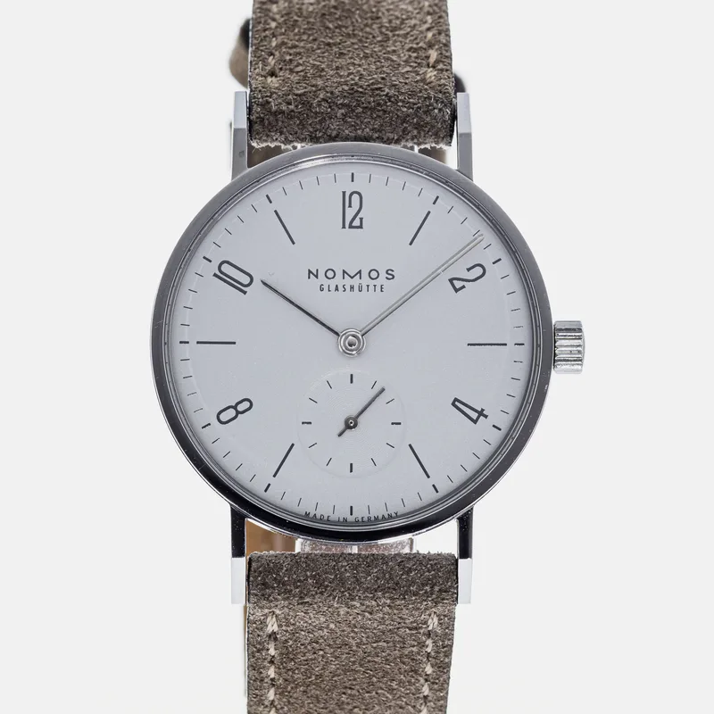 The Nomos Tangente 33 125 exemplifies the brand's commitment to minimalist design and precision craftsmanship. Renowned for its Bauhaus-inspired aesthetic, this timepiece features a sleek, white enamel dial with understated black hour markers and slender hands, all encased in a polished stainless steel case measuring 33mm in diameter. The Tangente 33 is a part of Nomos' Tangente collection, which is celebrated for its elegant simplicity and timeless appeal. Constructed with a manual-winding movement, the Nomos Alpha caliber offers both reliability and an impressive power reserve, ensuring accurate timekeeping. The watch is complemented by a fine leather strap, providing both comfort and durability, making it suitable for everyday wear or special occasions. With its classic design, the Tangente 33 125 runs true to size, appealing to those who appreciate a refined yet versatile accessory. This model reflects Nomos' dedication to German watchmaking excellence, making it a cherished addition for collectors and enthusiasts alike.