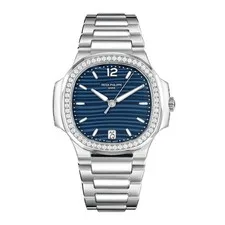 The Patek Philippe Nautilus Watch 35MM Blue Index Hour Markers Dial Stainless Steel embodies the pinnacle of luxury watchmaking. Renowned for its iconic design, the Nautilus collection was originally crafted by legendary designer Gérald Genta in the 1970s, revolutionizing the sports watch segment with its distinctive porthole-inspired case. This model features a polished stainless steel case measuring 35MM, a size that strikes the perfect balance between elegance and sportiness. The striking blue dial is complemented by luminous index hour markers, ensuring readability in various lighting conditions. The watch is powered by Patek Philippe's renowned automatic movement, offering precision and reliability. Its integrated stainless steel bracelet provides both durability and comfort, making it suitable for everyday wear or formal occasions. As part of Patek Philippe's esteemed lineup, the Nautilus stands as a symbol of sophistication and exclusivity. It is highly regarded for its craftsmanship and timeless appeal, making it a coveted piece for collectors and enthusiasts alike. This watch runs true to size, ensuring a comfortable fit on the wrist, and is celebrated for its enduring quality and classic style.