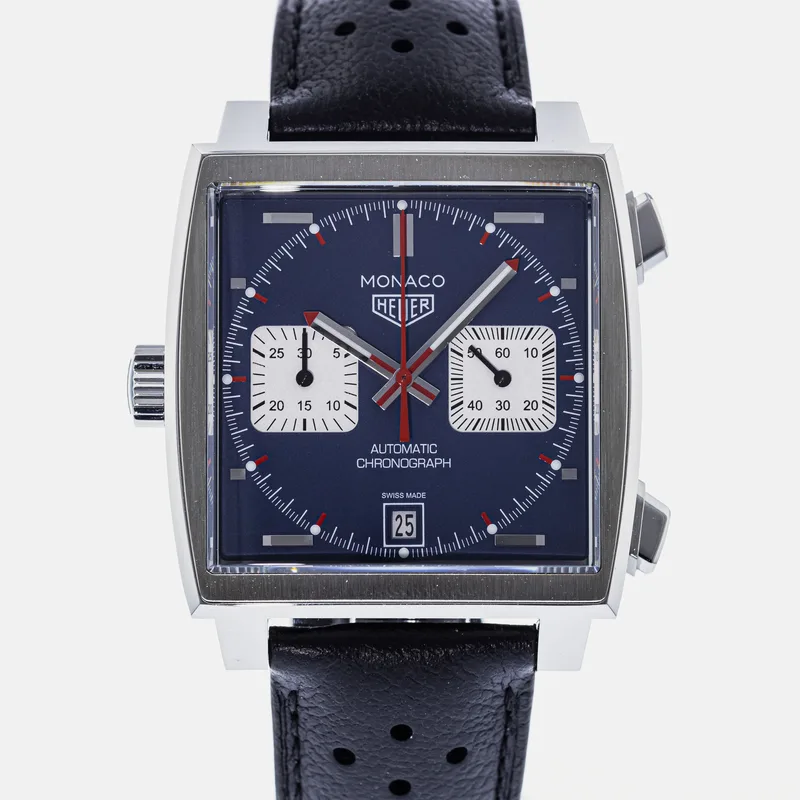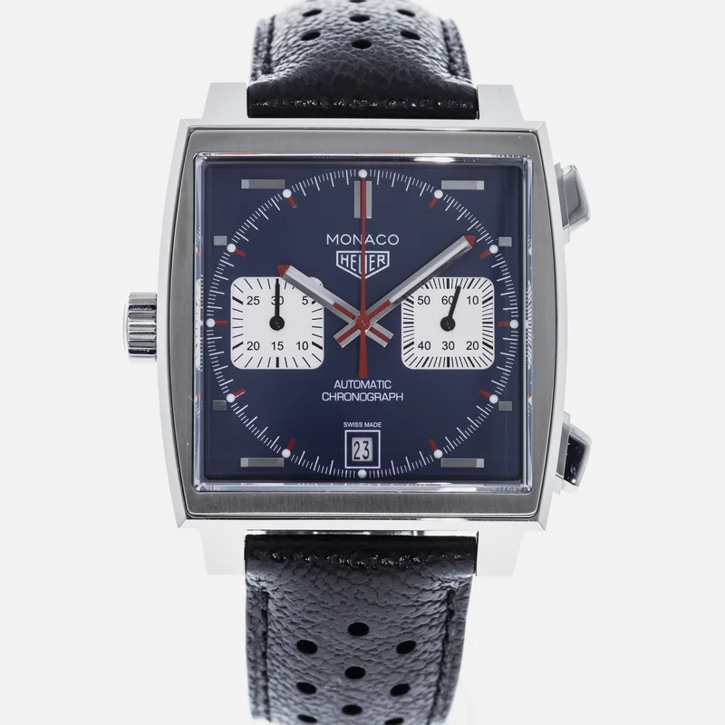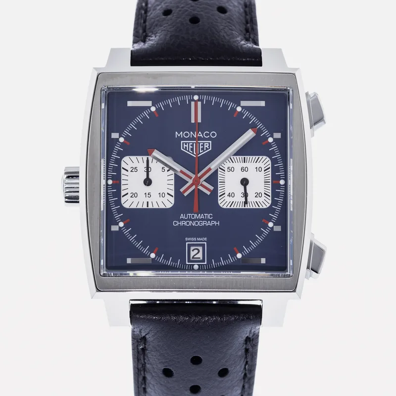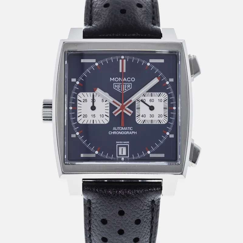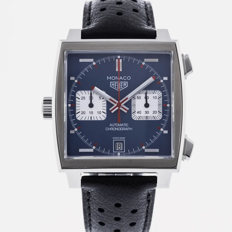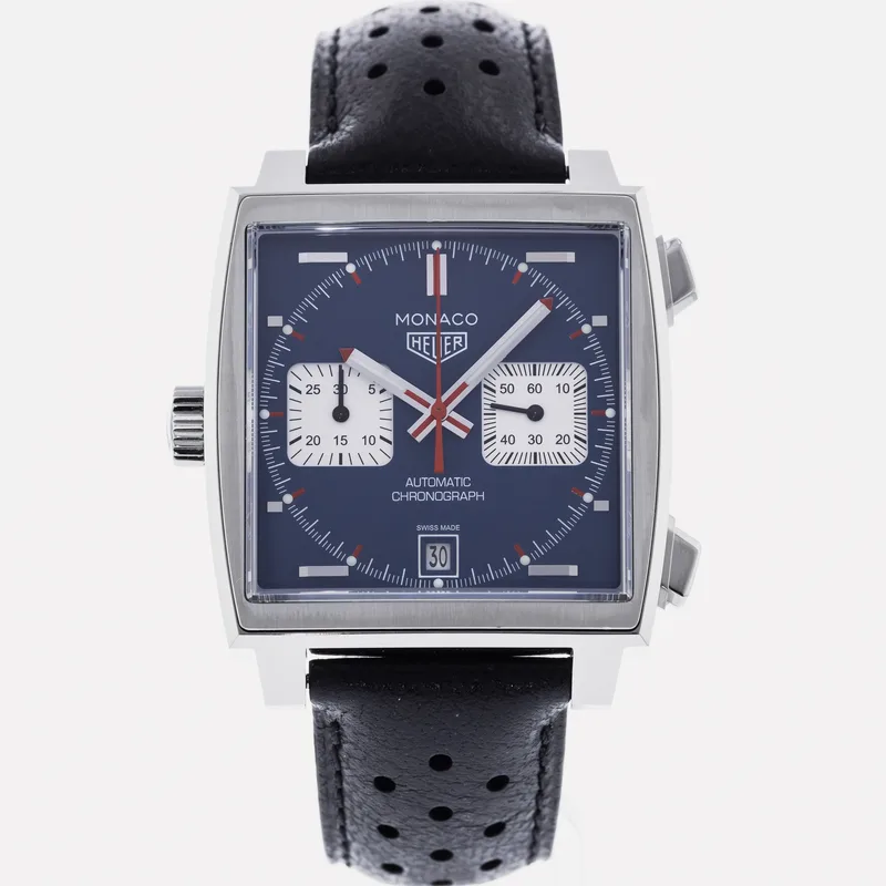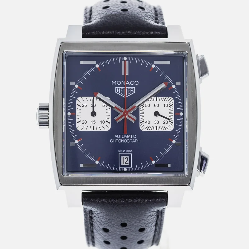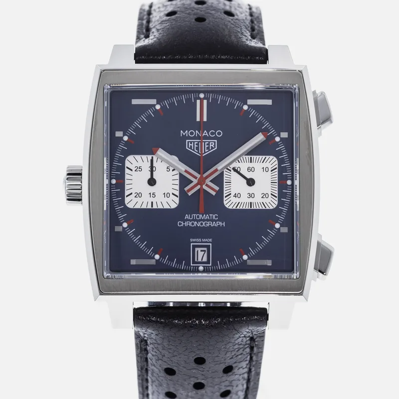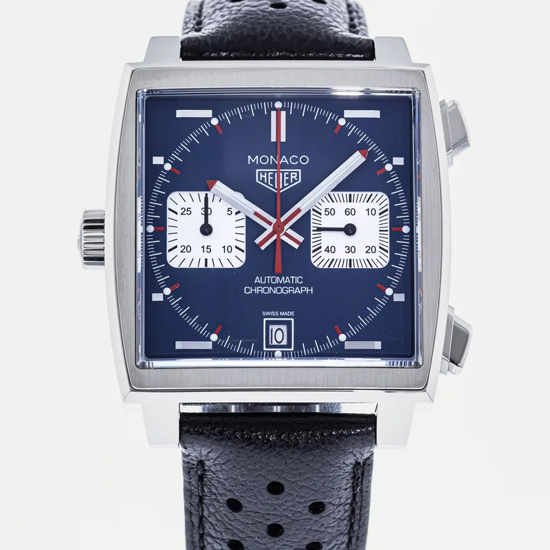 The TAG Heuer Monaco Calibre 11 Steve McQueen CAW211P is a celebrated timepiece that pays homage to the brand's rich motorsport heritage and its iconic association with the legendary actor and racing enthusiast, Steve McQueen. This watch features a square stainless steel case, which is a hallmark of the Monaco collection, and is complemented by a striking blue dial adorned with white sub-dials, offering a perfect blend of elegance and sportiness. Crafted with precision, the Calibre 11 movement is visible through the transparent case back, showcasing TAG Heuer's commitment to Swiss craftsmanship. The chronograph function allows for precise timing, making it ideal for motorsport aficionados. The watch is secured with a black leather strap that enhances both comfort and durability, ensuring it fits snugly on the wrist. With its bold design and heritage-driven aesthetics, the TAG Heuer Monaco Calibre 11 Steve McQueen CAW211P stands as a symbol of luxury and performance, making it a must-have for collectors and enthusiasts alike. This watch runs true to size and is known for its robust build, ensuring it withstands the rigors of everyday wear.