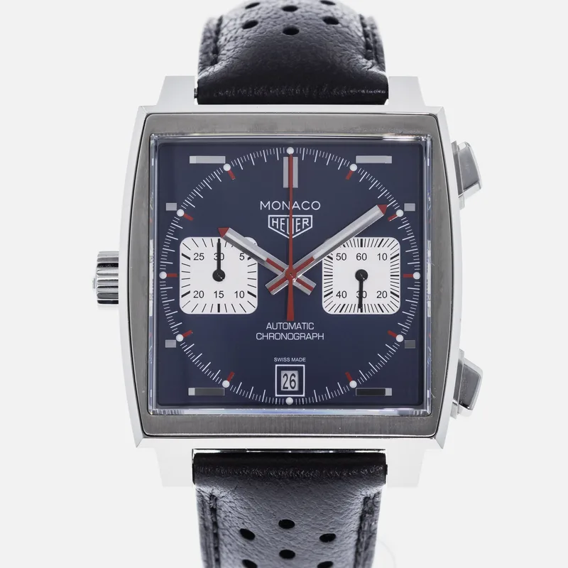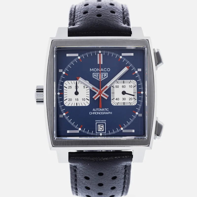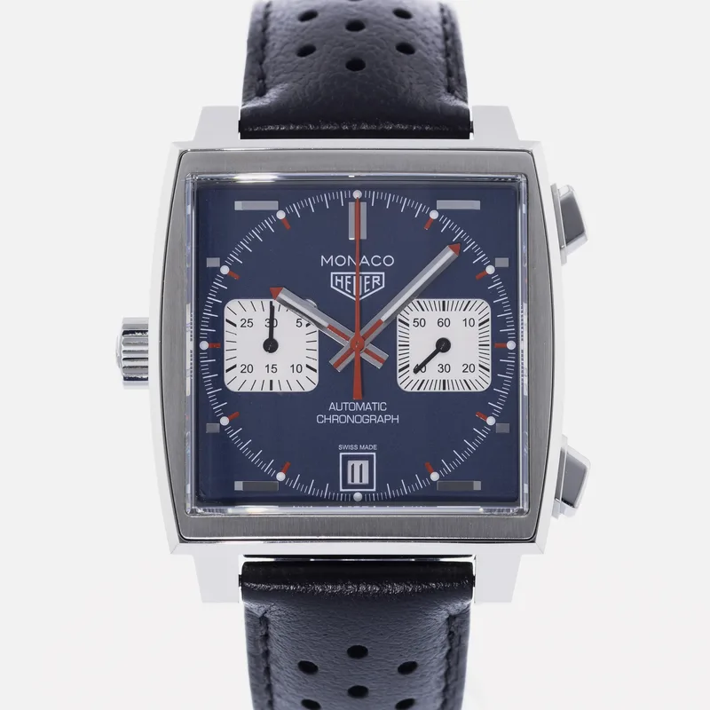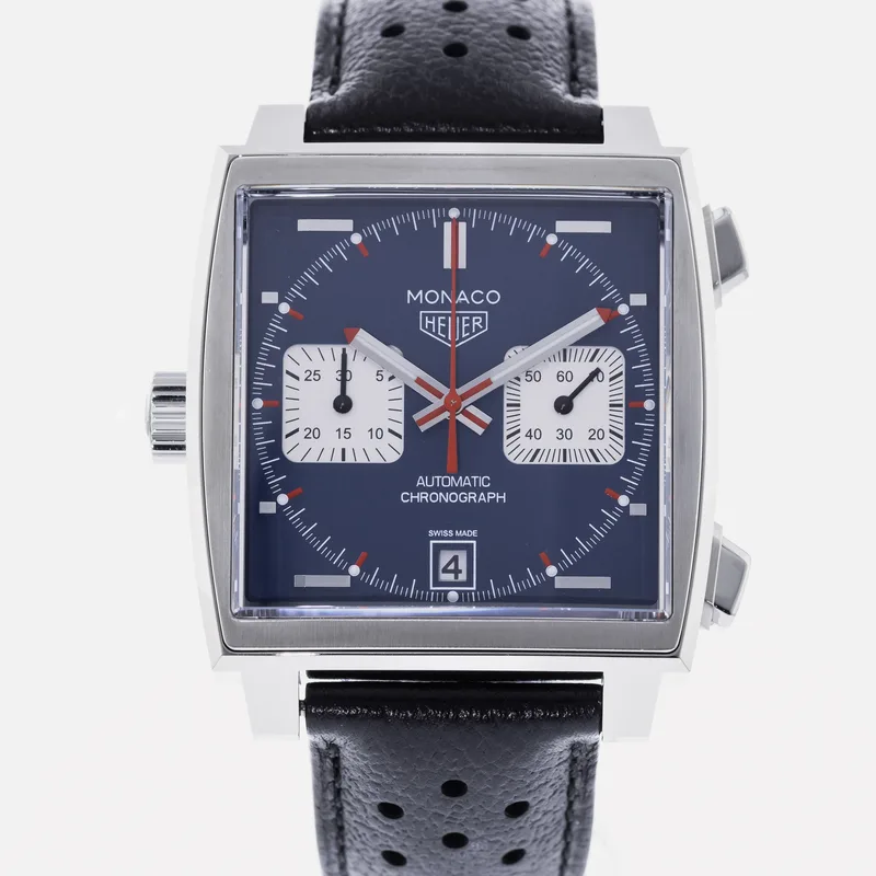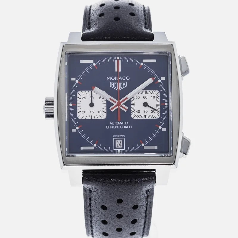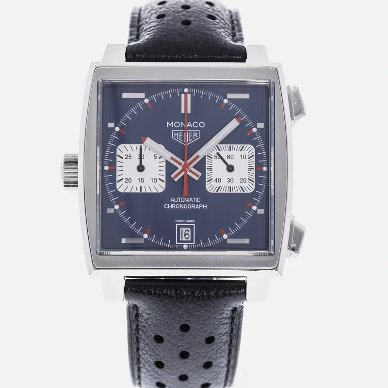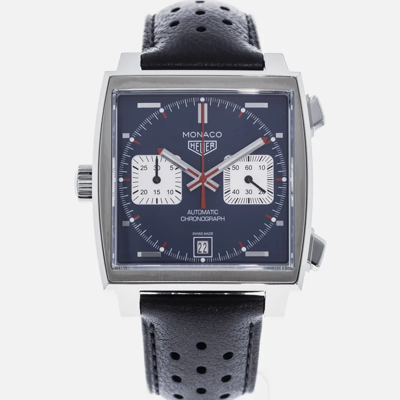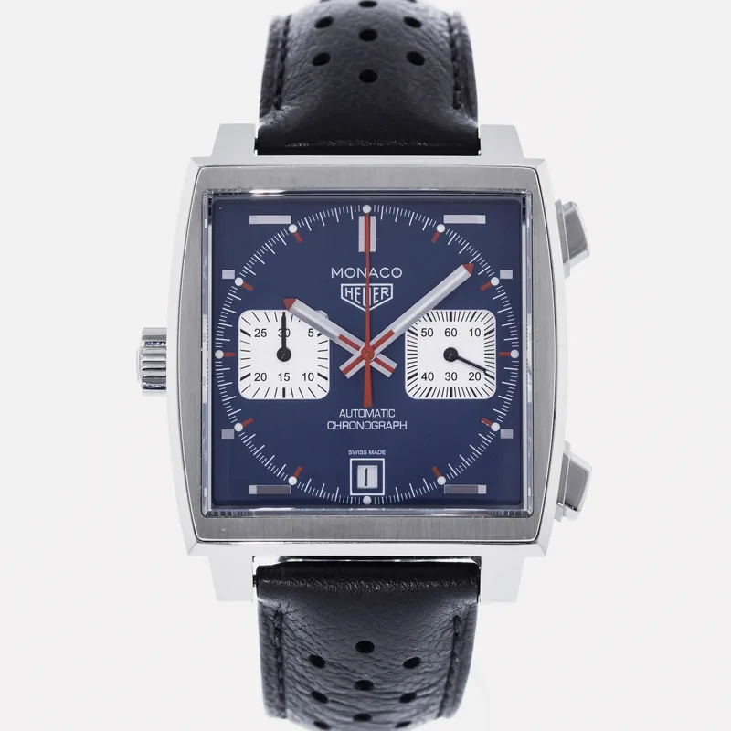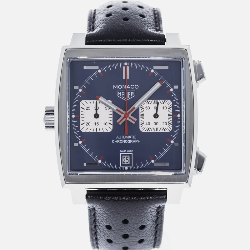 The TAG Heuer Monaco Calibre 11 Steve McQueen CAW211P is a celebrated timepiece that pays homage to the brand's rich motorsport heritage and its iconic association with the legendary actor and racing enthusiast, Steve McQueen. This watch features a square stainless steel case, which is a hallmark of the Monaco collection, and is complemented by a striking blue dial adorned with white sub-dials, offering a perfect blend of elegance and sportiness. Crafted with precision, the Calibre 11 movement is visible through the transparent case back, showcasing TAG Heuer's commitment to Swiss craftsmanship. The chronograph function allows for precise timing, making it ideal for motorsport aficionados. The watch is secured with a black leather strap that enhances both comfort and durability, ensuring it fits snugly on the wrist. With its bold design and heritage-driven aesthetics, the TAG Heuer Monaco Calibre 11 Steve McQueen CAW211P stands as a symbol of luxury and performance, making it a must-have for collectors and enthusiasts alike. This watch runs true to size and is known for its robust build, ensuring it withstands the rigors of everyday wear.