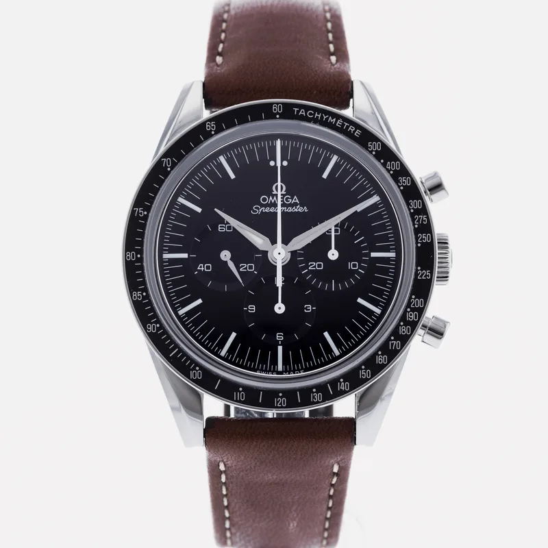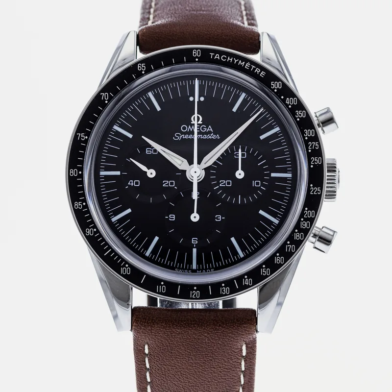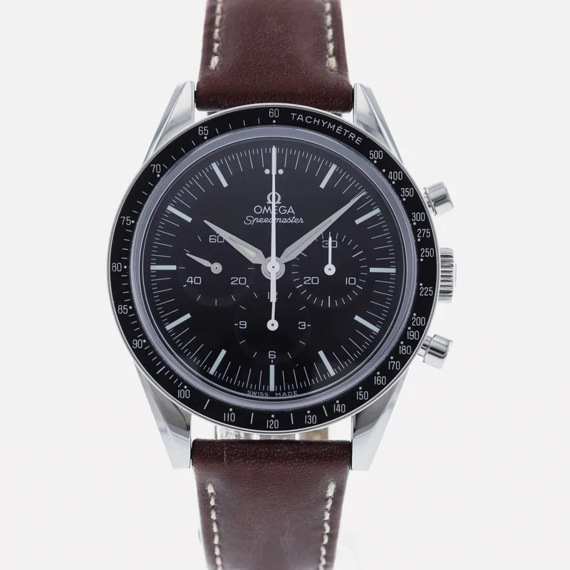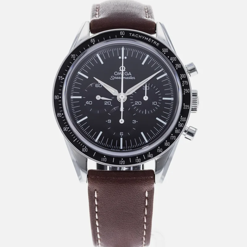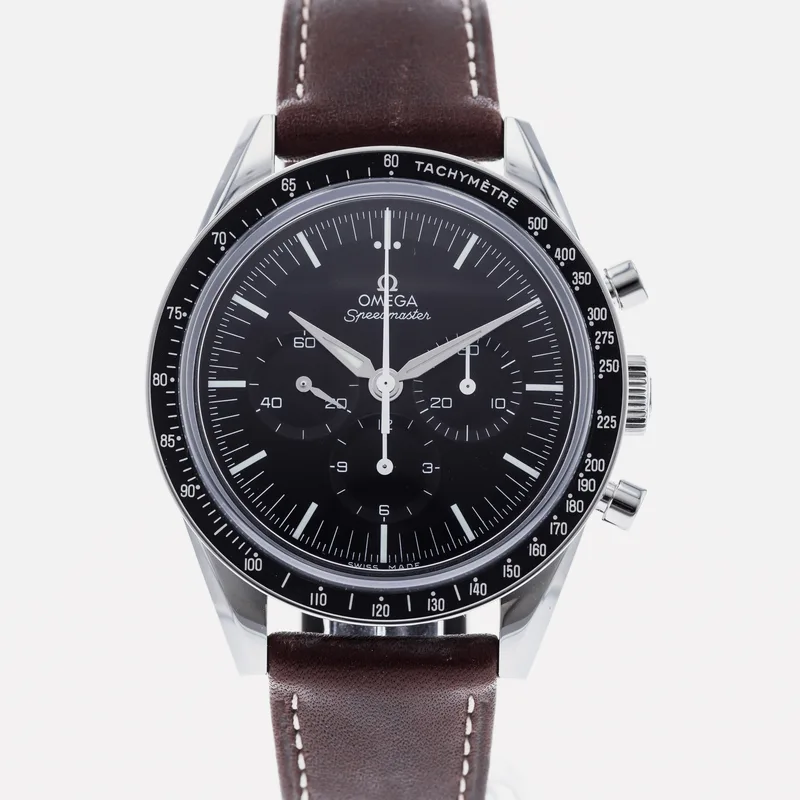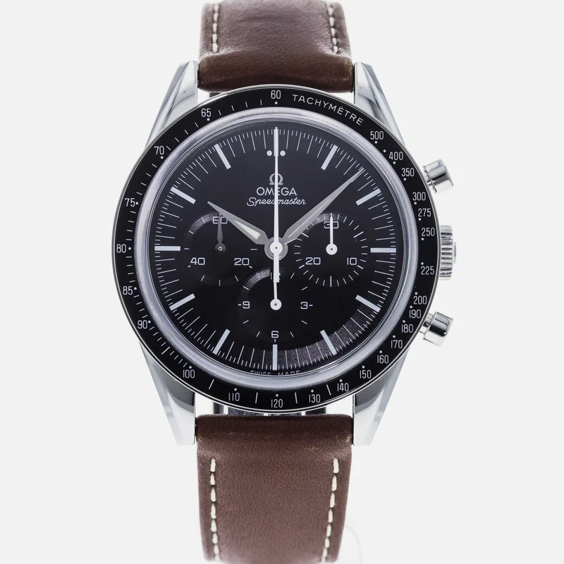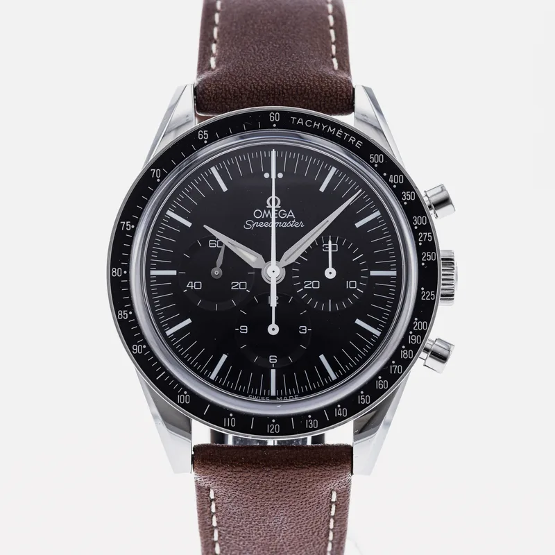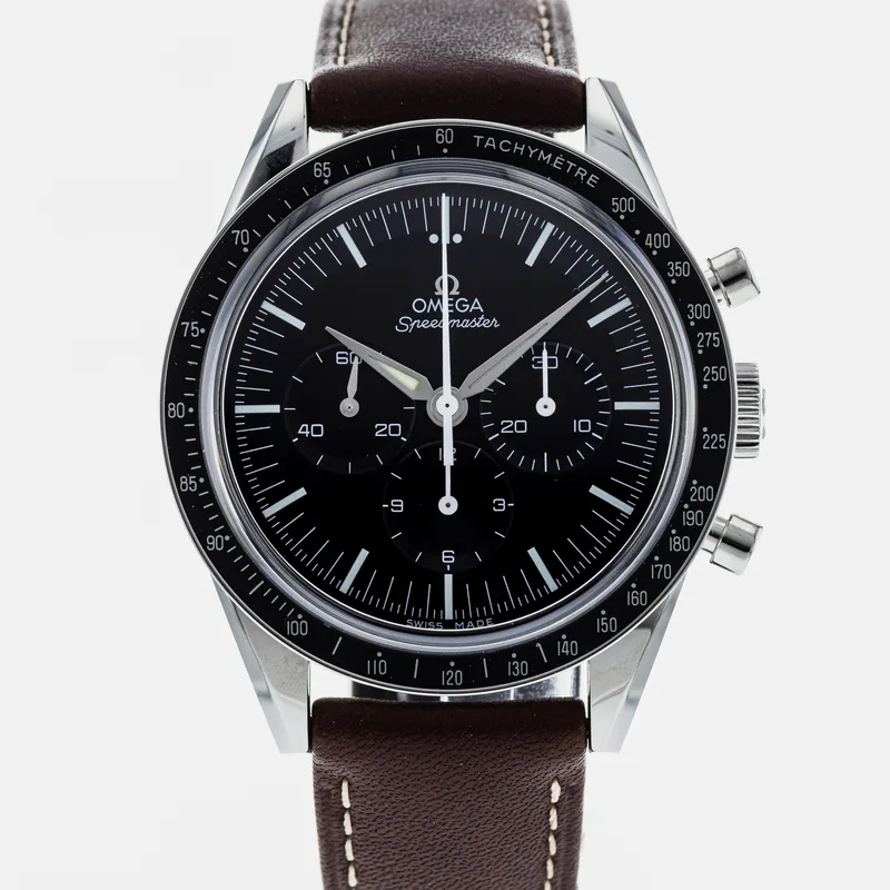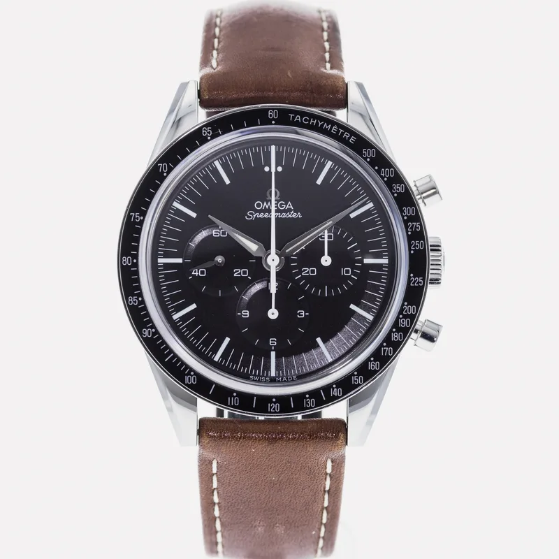 The OMEGA Speedmaster Moonwatch First Omega in Space 50th Anniversary Numbered Edition 311.32.40.30.01.001 is a distinguished tribute to the brand's storied legacy in space exploration. This model features a 40mm stainless steel case, showcasing a striking black dial adorned with luminous hour markers and hands for optimal visibility. The tachymetric scale on the bezel, a hallmark of the Speedmaster collection, enhances its functionality for timing events. Crafted with precision, the watch is powered by the OMEGA Caliber 3861, a manual-winding chronograph movement known for its reliability and accuracy. The timepiece is complemented by a black leather strap, providing both comfort and durability, making it suitable for everyday wear or special occasions. This numbered edition celebrates the 50th anniversary of the first OMEGA watch worn in space, solidifying its position within the brand's iconic lineup. With its timeless design and robust construction, the Speedmaster Moonwatch remains a favorite among collectors and enthusiasts alike.