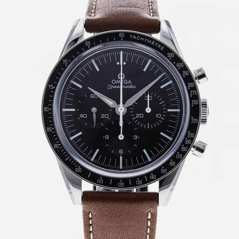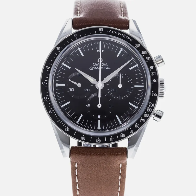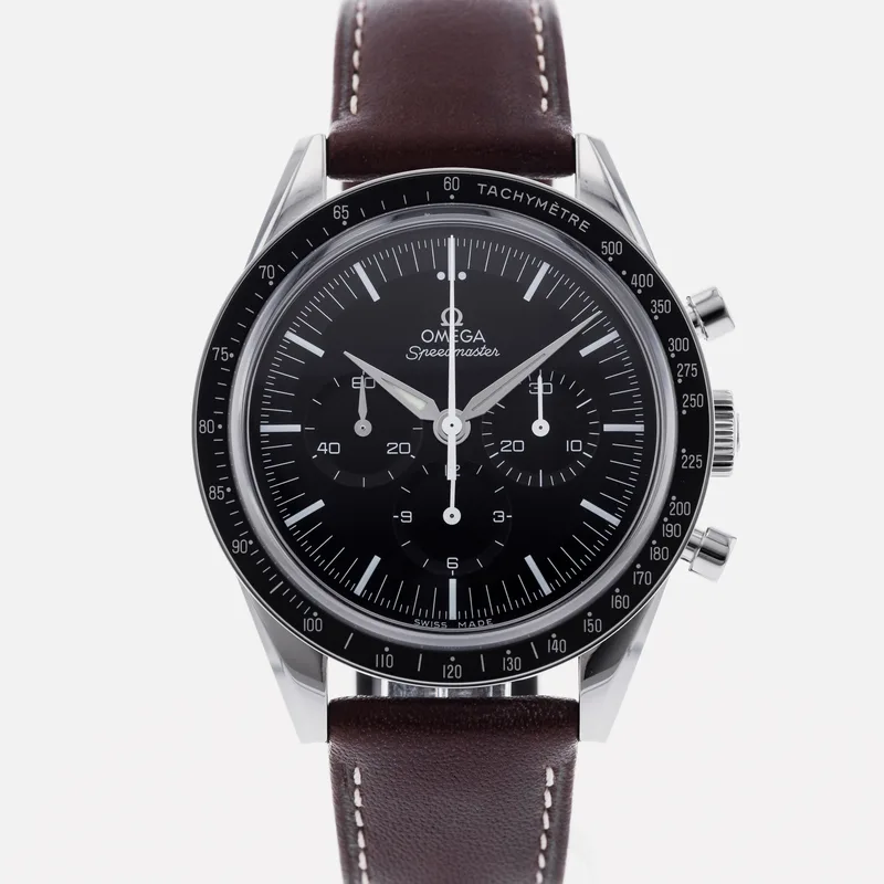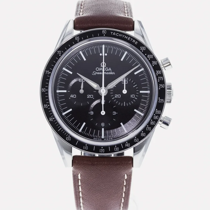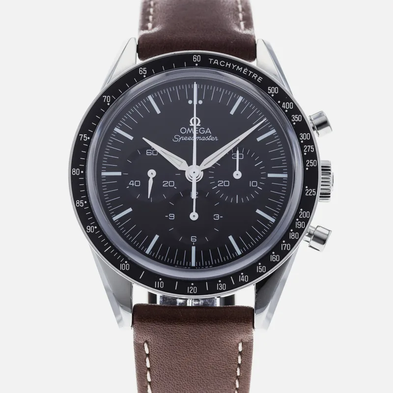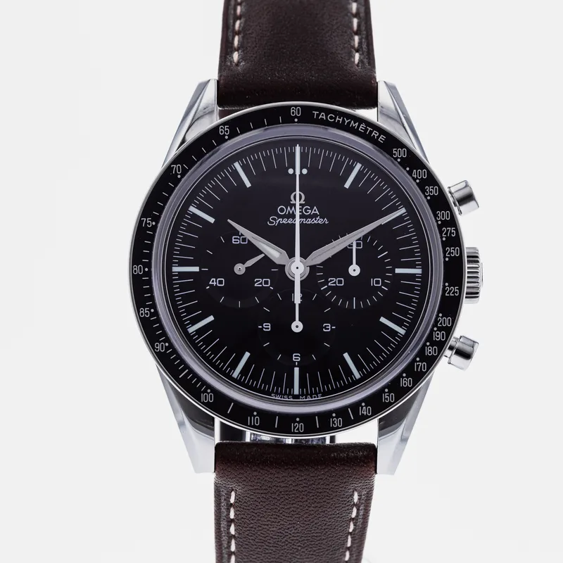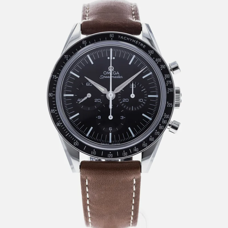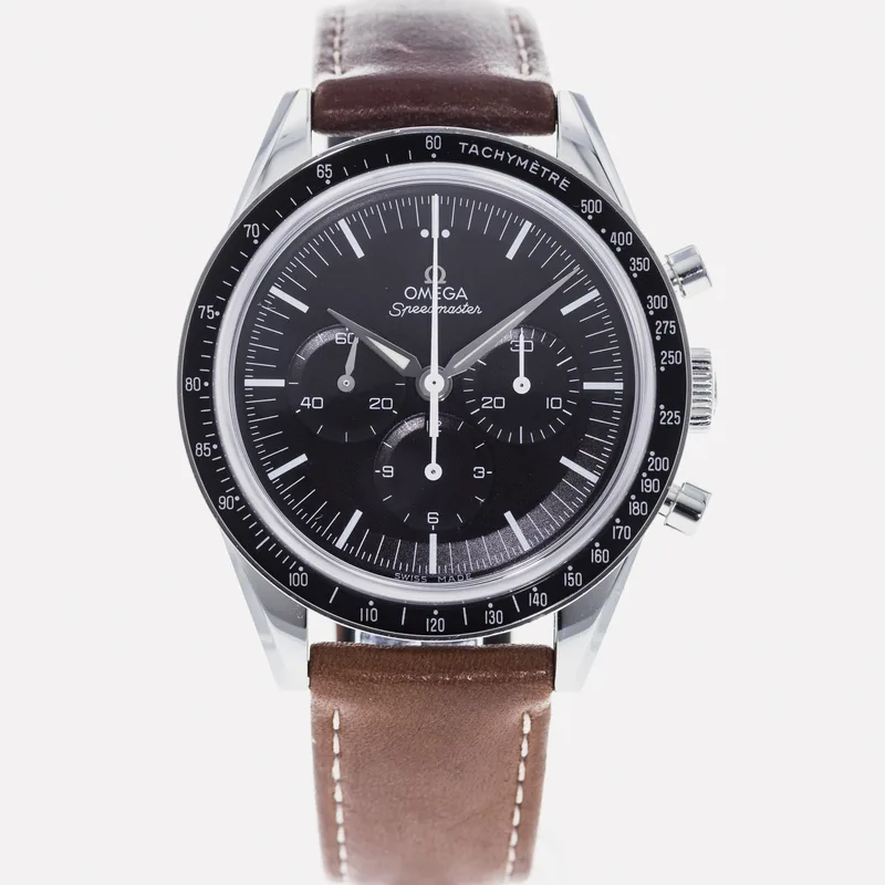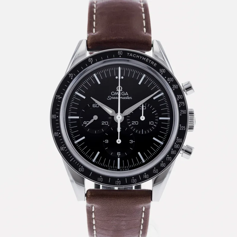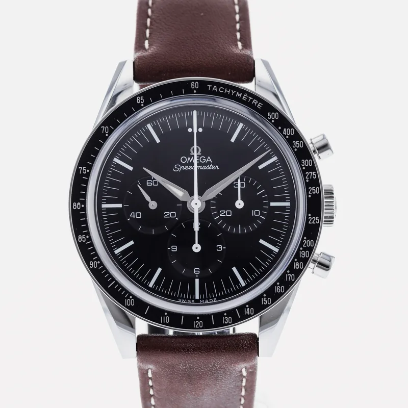 The OMEGA Speedmaster Moonwatch First Omega in Space 50th Anniversary Numbered Edition 311.32.40.30.01.001 is a distinguished tribute to the brand's storied legacy in space exploration. This model features a 40mm stainless steel case, showcasing a striking black dial adorned with luminous hour markers and hands for optimal visibility. The tachymetric scale on the bezel, a hallmark of the Speedmaster collection, enhances its functionality for timing events. Crafted with precision, the watch is powered by the OMEGA Caliber 3861, a manual-winding chronograph movement known for its reliability and accuracy. The timepiece is complemented by a black leather strap, providing both comfort and durability, making it suitable for everyday wear or special occasions. This numbered edition celebrates the 50th anniversary of the first OMEGA watch worn in space, solidifying its position within the brand's iconic lineup. With its timeless design and robust construction, the Speedmaster Moonwatch remains a favorite among collectors and enthusiasts alike.