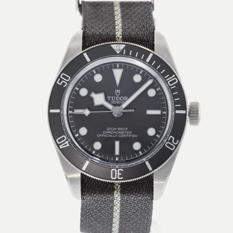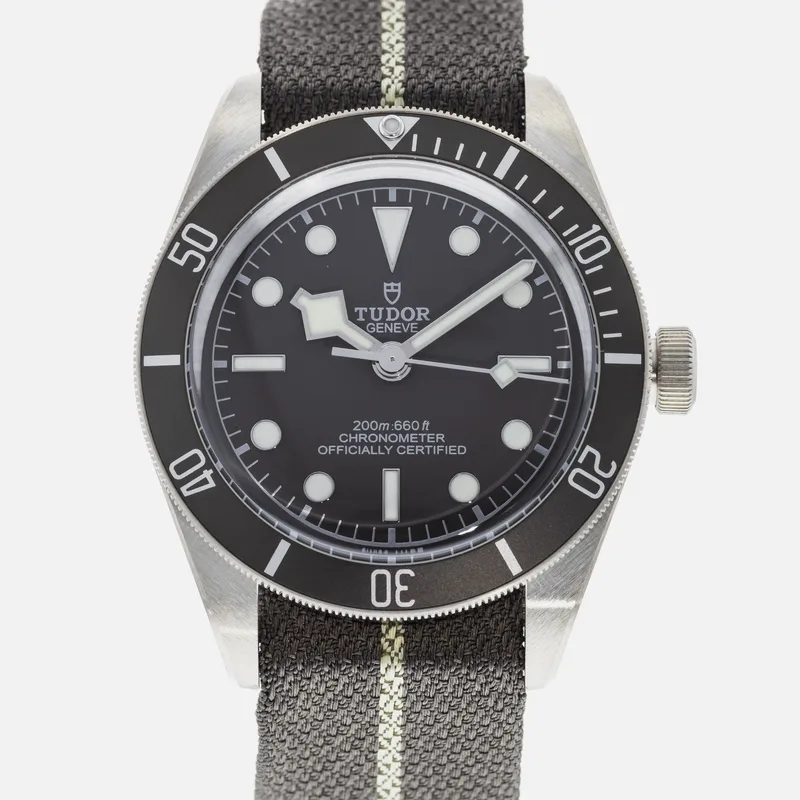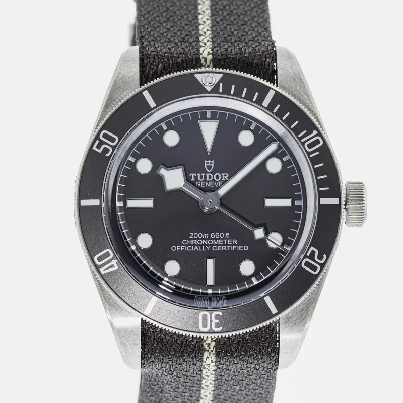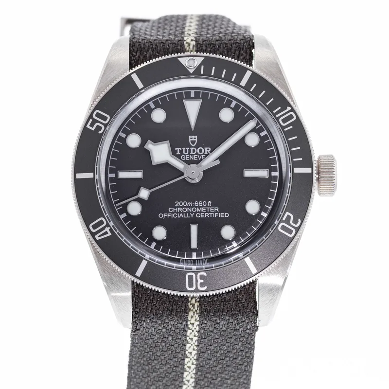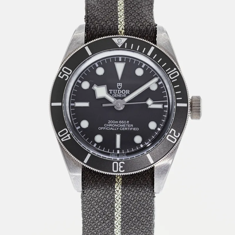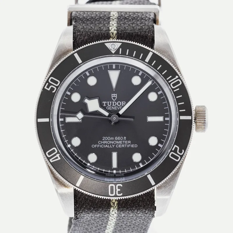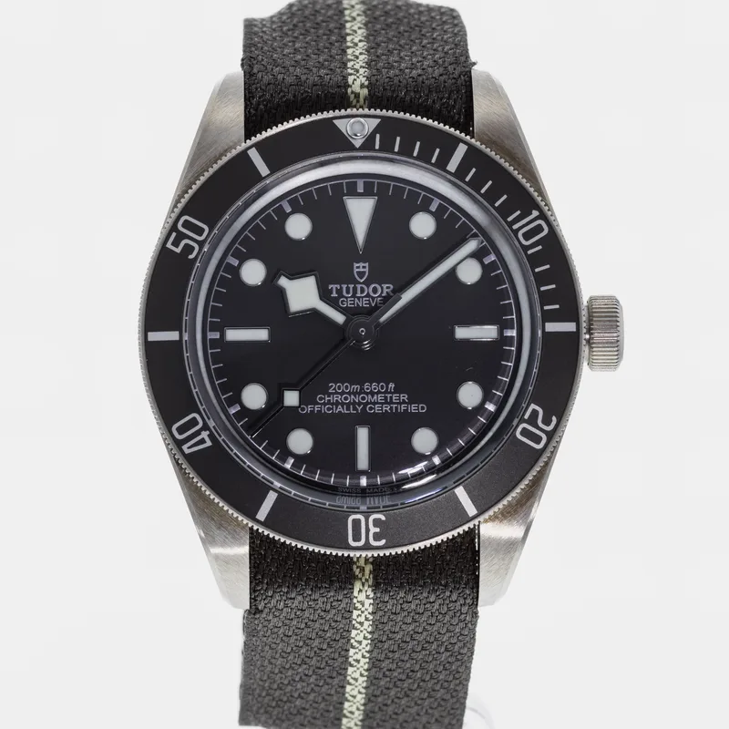The Tudor Heritage Black Bay Fifty-Eight 925 79010 embodies the brand's commitment to craftsmanship and classic design. This timepiece features a 39mm case crafted from sterling silver, offering a unique aesthetic that stands out among traditional stainless steel models. The watch showcases a striking black dial with luminous hour markers, ensuring optimal readability in various lighting conditions. Designed with a vintage-inspired aesthetic, the Black Bay Fifty-Eight pays homage to Tudor's diving heritage while integrating modern technology. It is powered by the Tudor Caliber MT5400, a COSC-certified chronometer that guarantees precision and reliability. The unidirectional rotatable bezel, adorned with a matte black insert, enhances its functionality for divers and watch enthusiasts alike. The watch is paired with a comfortable fabric strap, providing both durability and style, while the 200-meter water resistance makes it suitable for underwater activities. As part of Tudor's iconic Heritage collection, the Black Bay Fifty-Eight 925 79010 is a testament to the brand's rich history and dedication to quality, making it a coveted choice for collectors and casual wearers alike.