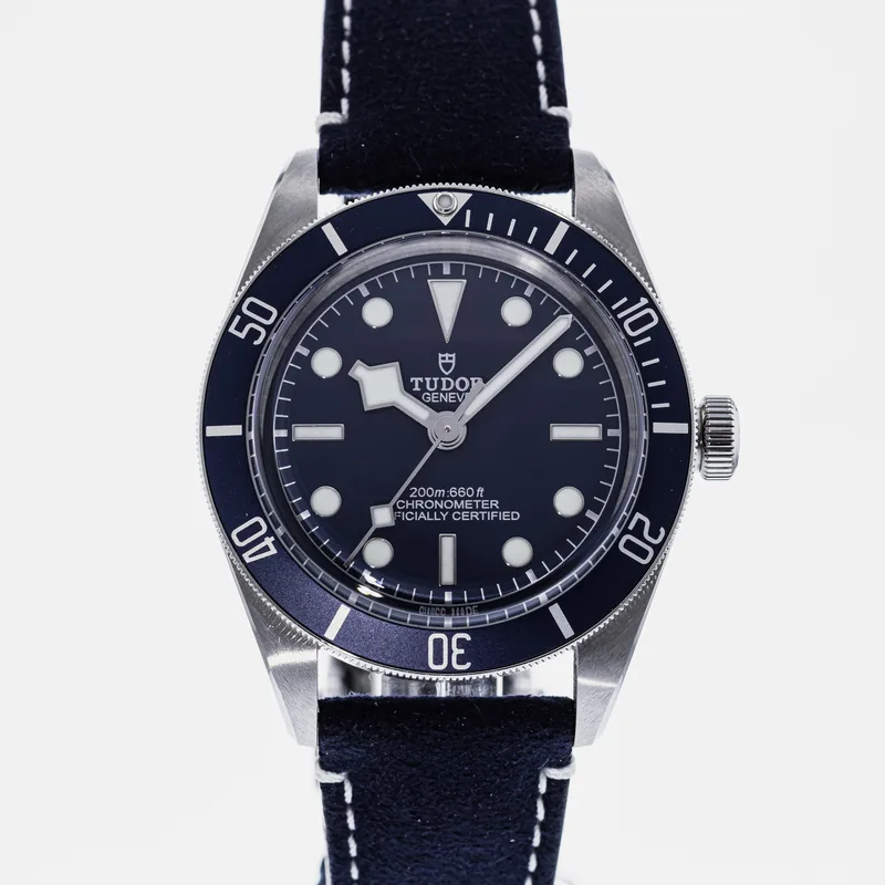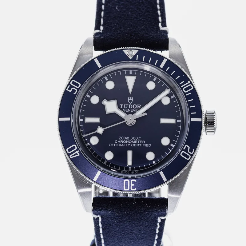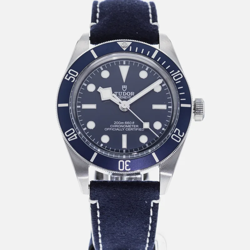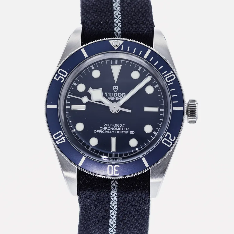The Tudor Heritage Black Bay Fifty-Eight Blue 79030B is a quintessential dive watch that embodies Tudor's rich maritime heritage. With its striking blue dial and vintage-inspired aesthetics, this model draws inspiration from Tudor's iconic dive watches of the late 1950s. The 39mm stainless steel case features a unidirectional rotatable bezel, ensuring functionality for underwater exploration while maintaining a classic silhouette. Crafted from high-quality materials, the Black Bay Fifty-Eight Blue showcases a robust, scratch-resistant sapphire crystal and a water resistance of up to 200 meters, making it both stylish and durable. The luminous hour markers and hands provide excellent legibility in low-light conditions, a hallmark of Tudor's commitment to performance. This watch is powered by Tudor's in-house Caliber MT5402 movement, known for its reliability and precision. It features a comfortable and adjustable fabric strap, which enhances its sporty yet elegant appeal. The Tudor Heritage Black Bay Fifty-Eight Blue is a versatile timepiece that runs true to size, making it an ideal choice for both casual and formal occasions.