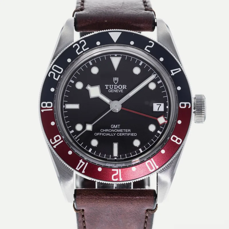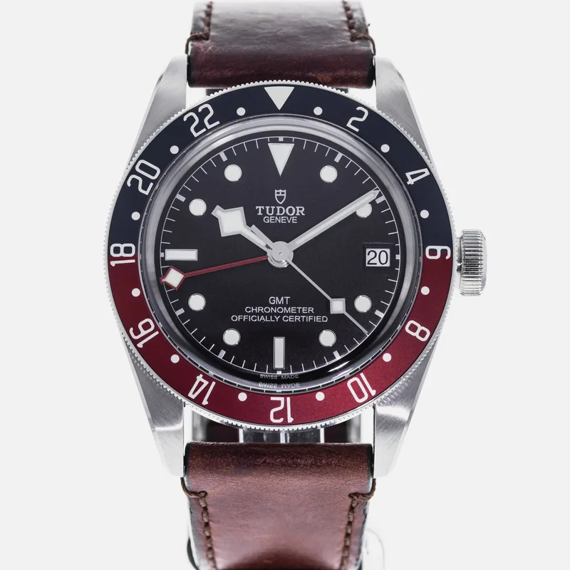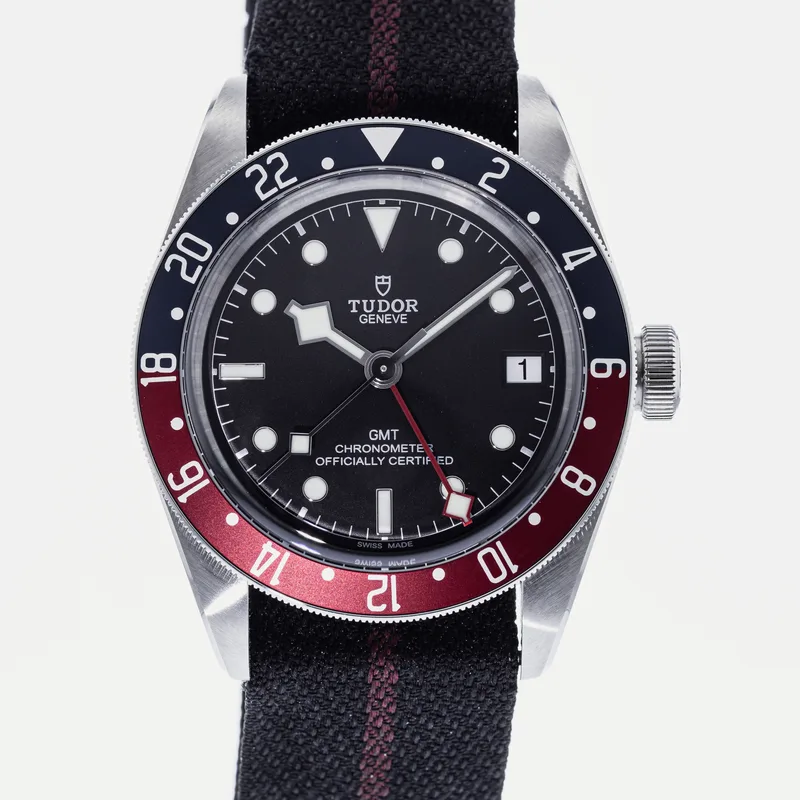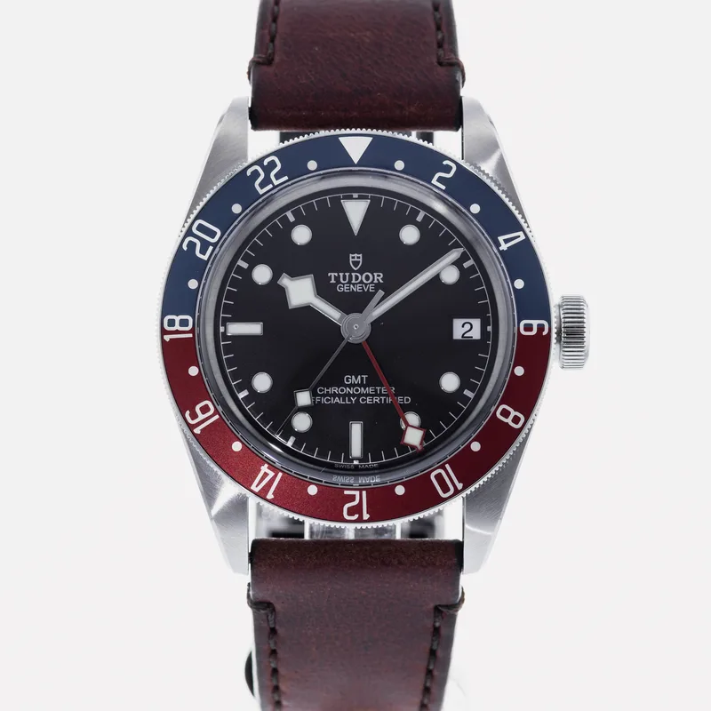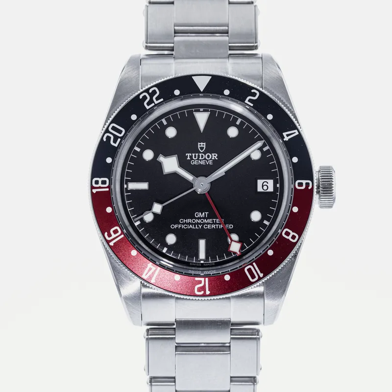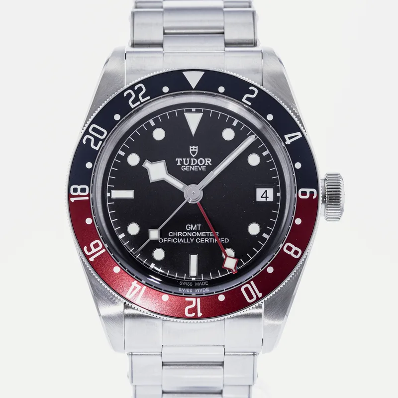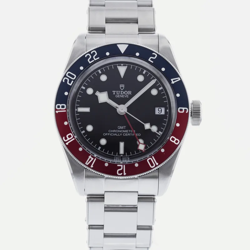 The Tudor Heritage Black Bay GMT Pepsi 79830RB is a quintessential timepiece that captures the spirit of exploration and adventure. This watch features a robust 41mm stainless steel case, showcasing Tudor's commitment to durability and craftsmanship. The striking blue and red bezel, reminiscent of the classic "Pepsi" colorway, is crafted from anodized aluminum, providing a vibrant contrast against the matte black dial. Equipped with the Tudor Caliber MT5612 movement, the Black Bay GMT offers a reliable automatic mechanism with a 70-hour power reserve, ensuring precision and performance. The watch includes a date function and a GMT hand, allowing wearers to track multiple time zones effortlessly. Its 200-meter water resistance enhances its versatility, making it ideal for both everyday wear and aquatic adventures. The Heritage Black Bay collection pays homage to Tudor's rich diving history while integrating modern technology and design. This model runs true to size and features a comfortable, adjustable bracelet, ensuring a secure fit for various wrist sizes. With its blend of classic aesthetics and contemporary functionality, the Tudor Heritage Black Bay GMT Pepsi is a standout choice for watch enthusiasts and collectors alike.