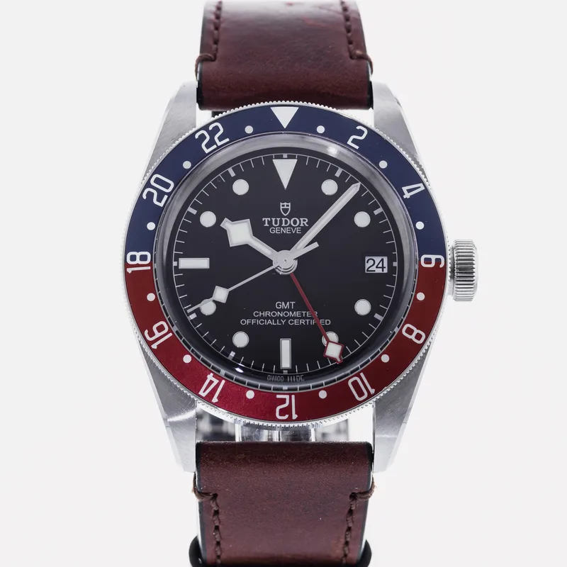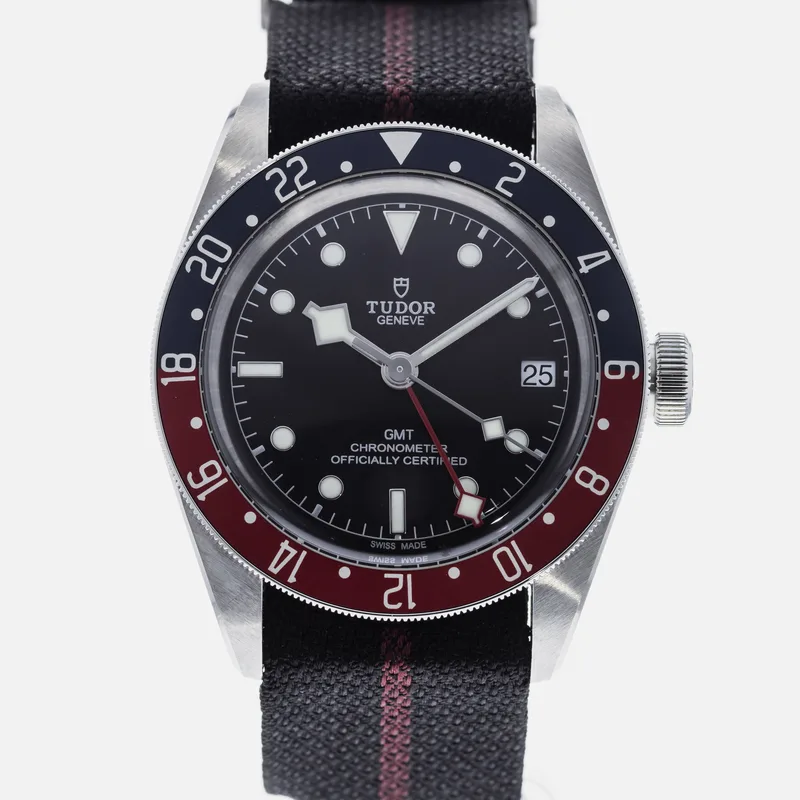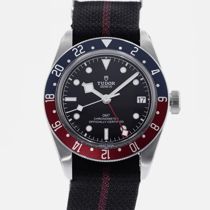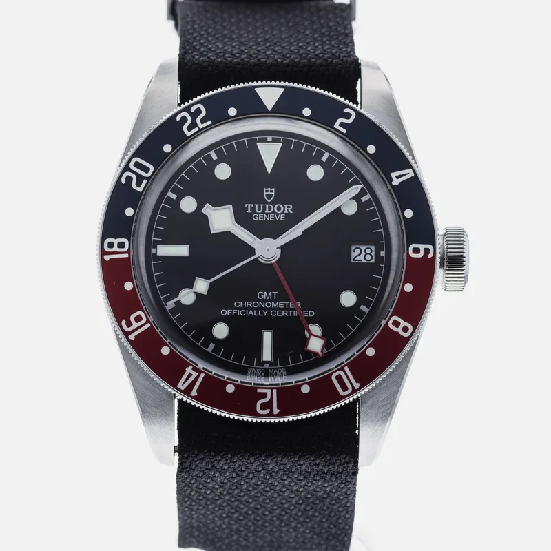 The Tudor Heritage Black Bay GMT Pepsi 79830 is a standout timepiece that seamlessly blends vintage aesthetics with modern functionality. Drawing inspiration from Tudor's rich diving watch heritage, this model features a robust 41mm stainless steel case, providing both durability and a refined look. The iconic Pepsi bezel, characterized by its bold red and blue colorway, not only adds a striking visual element but also allows for easy tracking of multiple time zones. The watch is powered by Tudor's in-house Caliber MT5612 movement, ensuring precision and reliability. Its matte black dial is complemented by luminous hour markers and hands, enhancing legibility in low-light conditions. The Heritage Black Bay GMT also features a water resistance of up to 200 meters, making it suitable for aquatic adventures. With a comfortable fabric strap or an optional stainless steel bracelet, this watch runs true to size and is designed for daily wear. The Tudor Heritage Black Bay GMT Pepsi 79830 exemplifies the brand's commitment to quality and style, making it a coveted choice among watch enthusiasts and collectors alike.