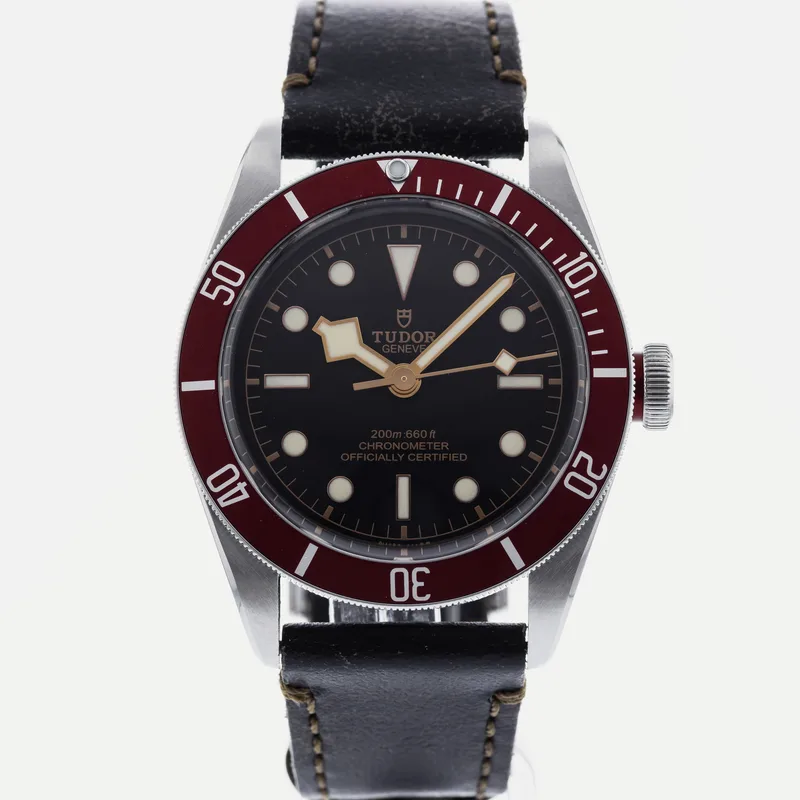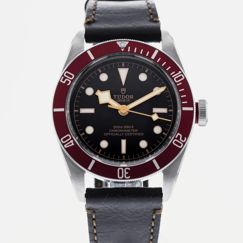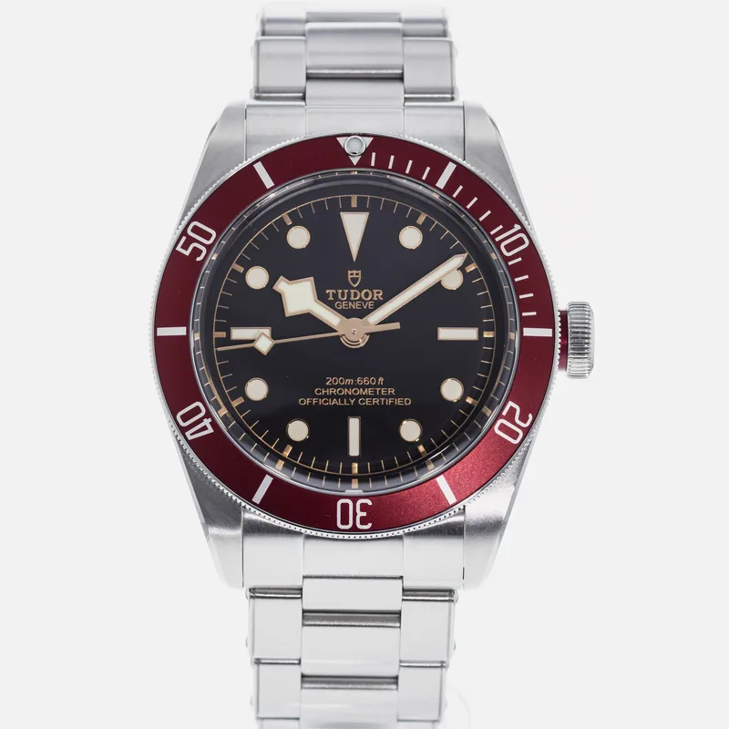 The Tudor Heritage Black Bay Red 79230 is a distinguished timepiece that embodies Tudor's rich diving watch heritage. This model features a robust 41mm stainless steel case, which is both durable and stylish, paired with a striking matte black dial that enhances legibility. The signature red bezel, crafted from anodized aluminum, adds a vibrant touch, making it a standout in the Black Bay collection. Designed for both functionality and elegance, the watch is equipped with a self-winding Tudor Caliber 2824 movement, ensuring precise timekeeping. The unidirectional rotatable bezel and luminous hour markers make it well-suited for underwater adventures, while the vintage-inspired aesthetics appeal to watch enthusiasts and collectors alike. The Tudor Heritage Black Bay Red is often praised for its comfortable fit and versatile style, making it suitable for various occasions, from casual outings to formal events. With its classic design and modern engineering, this watch remains a key piece in Tudor's lineup, reflecting the brand's commitment to quality and craftsmanship.